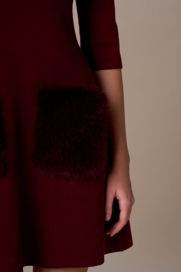 Abito in maglia elasticizzato corto dolcevita con tasche in ecopelliccia tono su tono.
