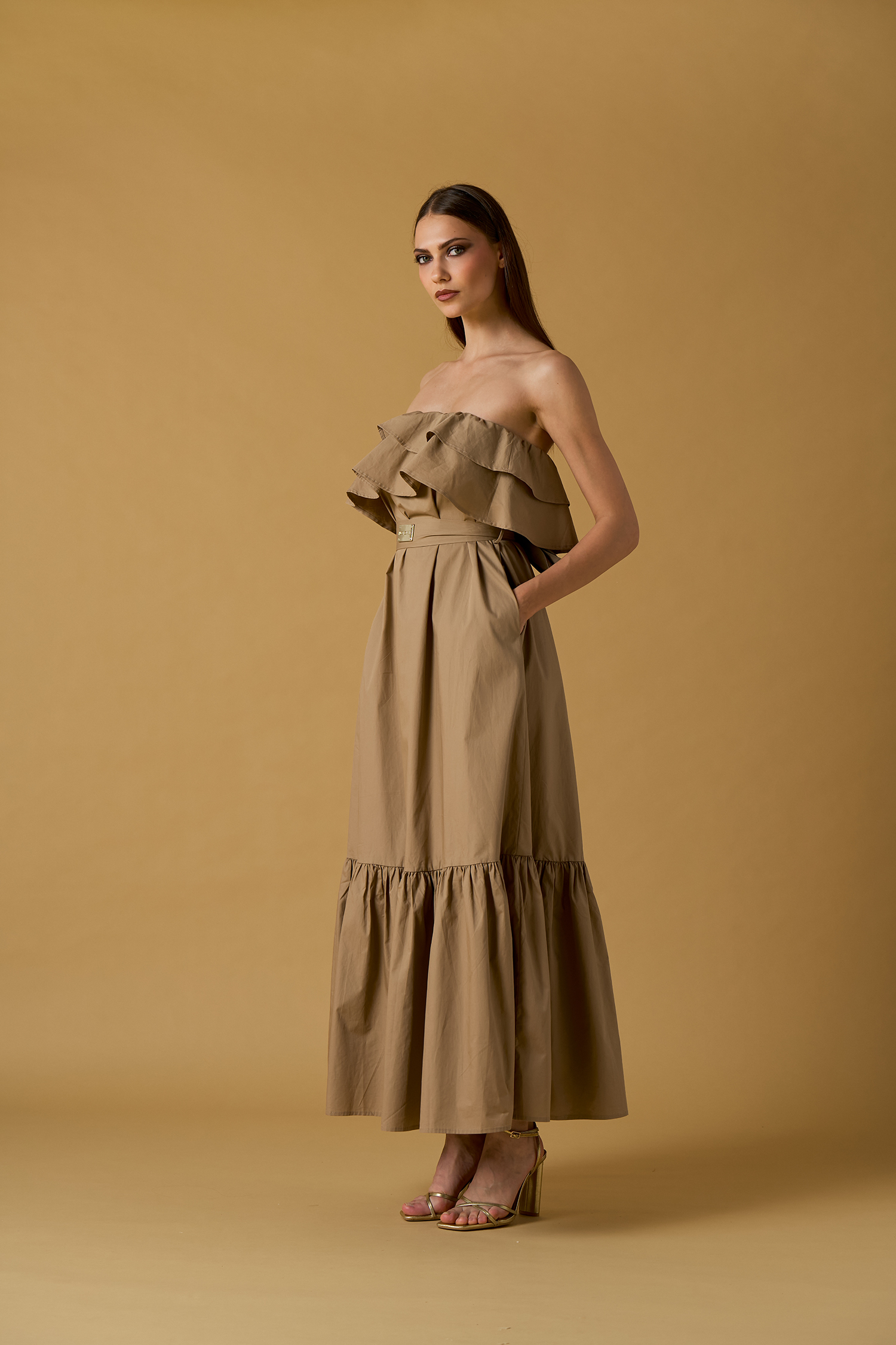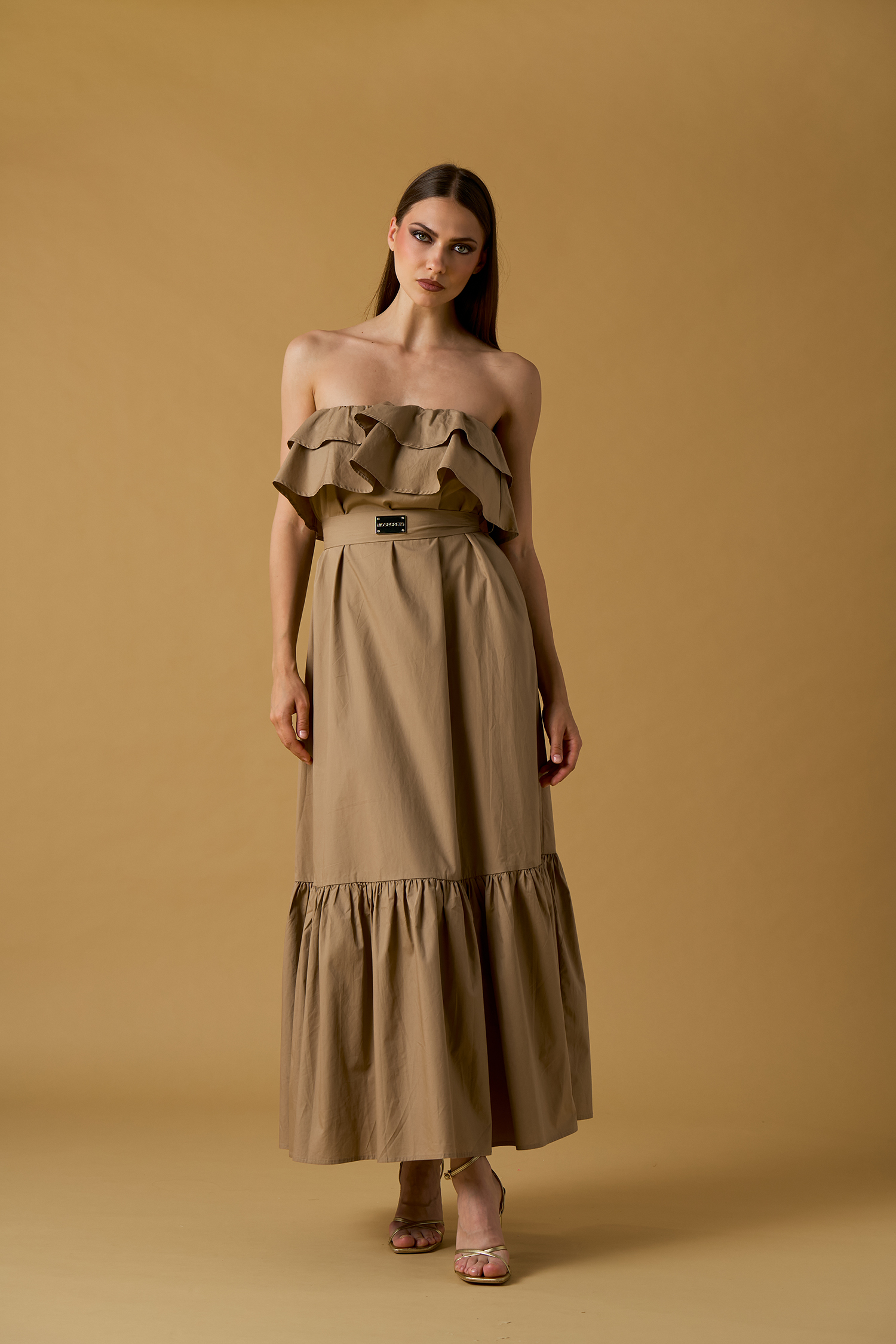 Abito lungo in cotone  a fascia safari con maxi volant sul seno, cintura in vita e balza sul fondo.