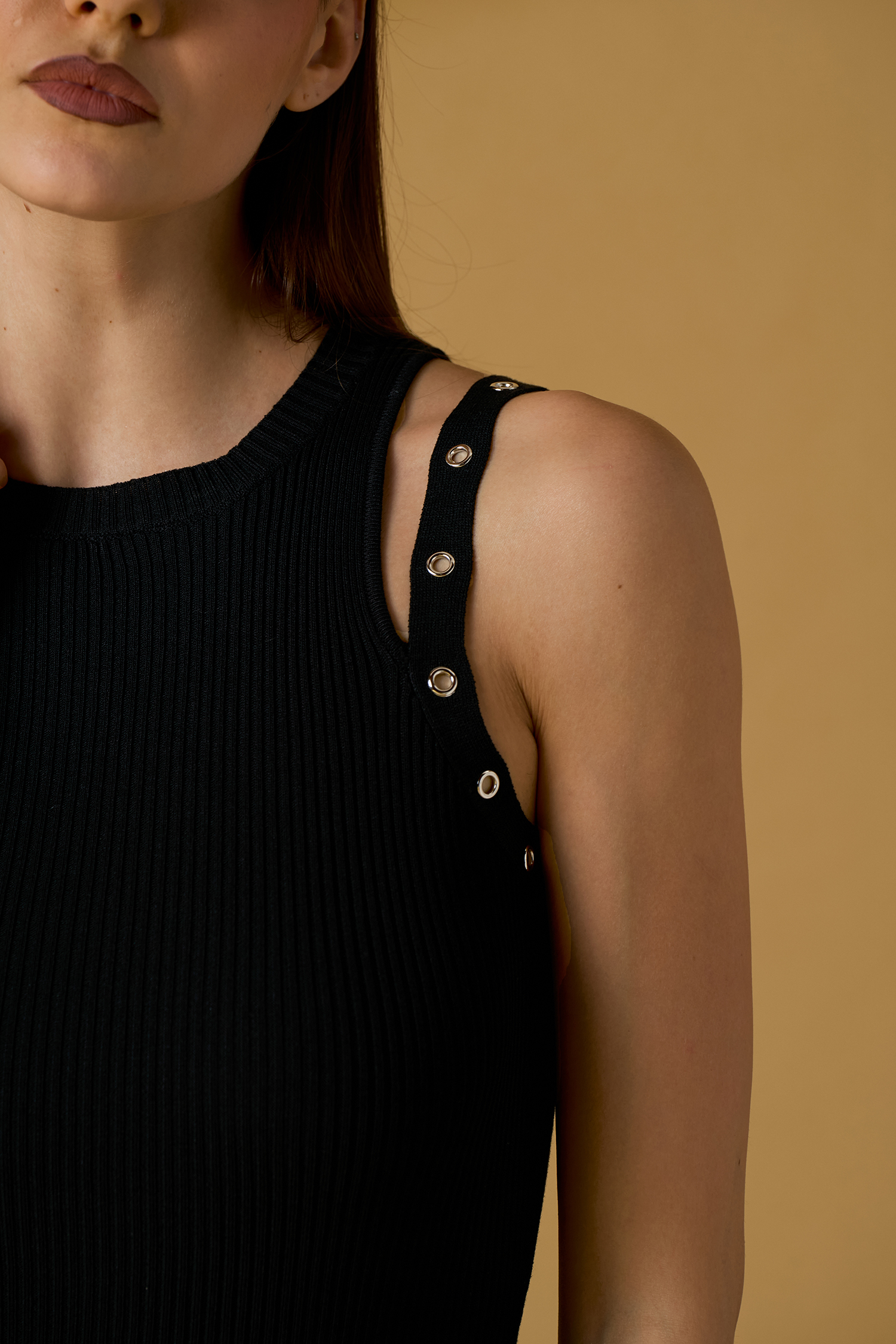 Abito lungo nero smanicato in maglina con applicazioni ad anello sulle spalline e profondo spacco laterale.