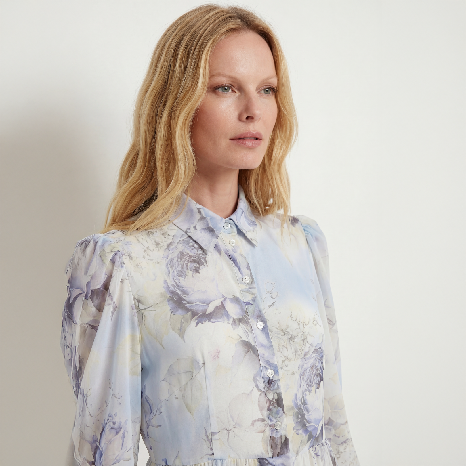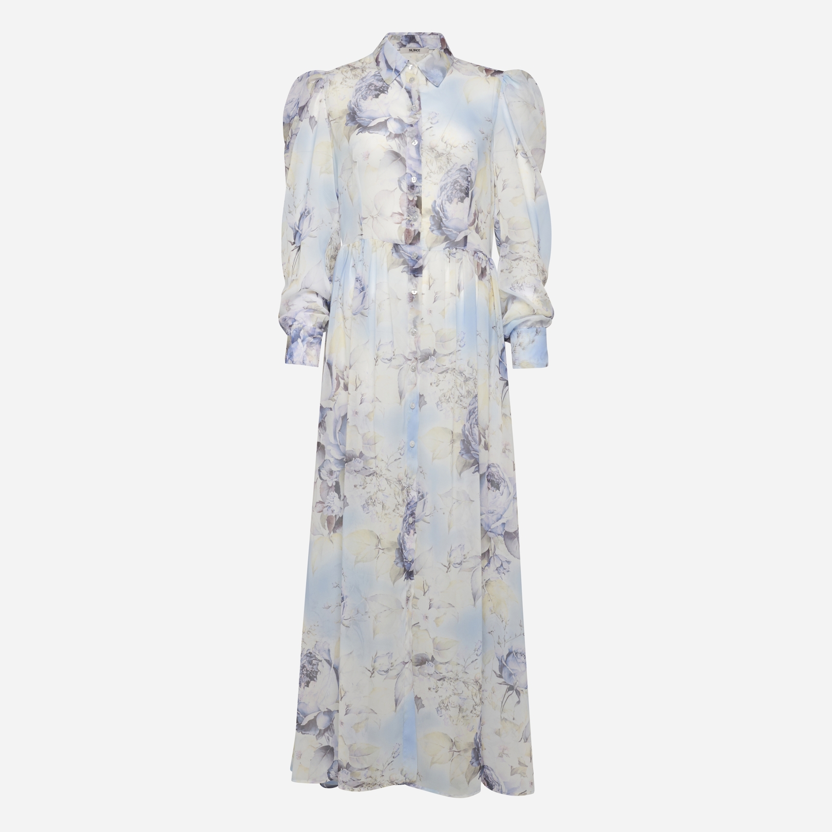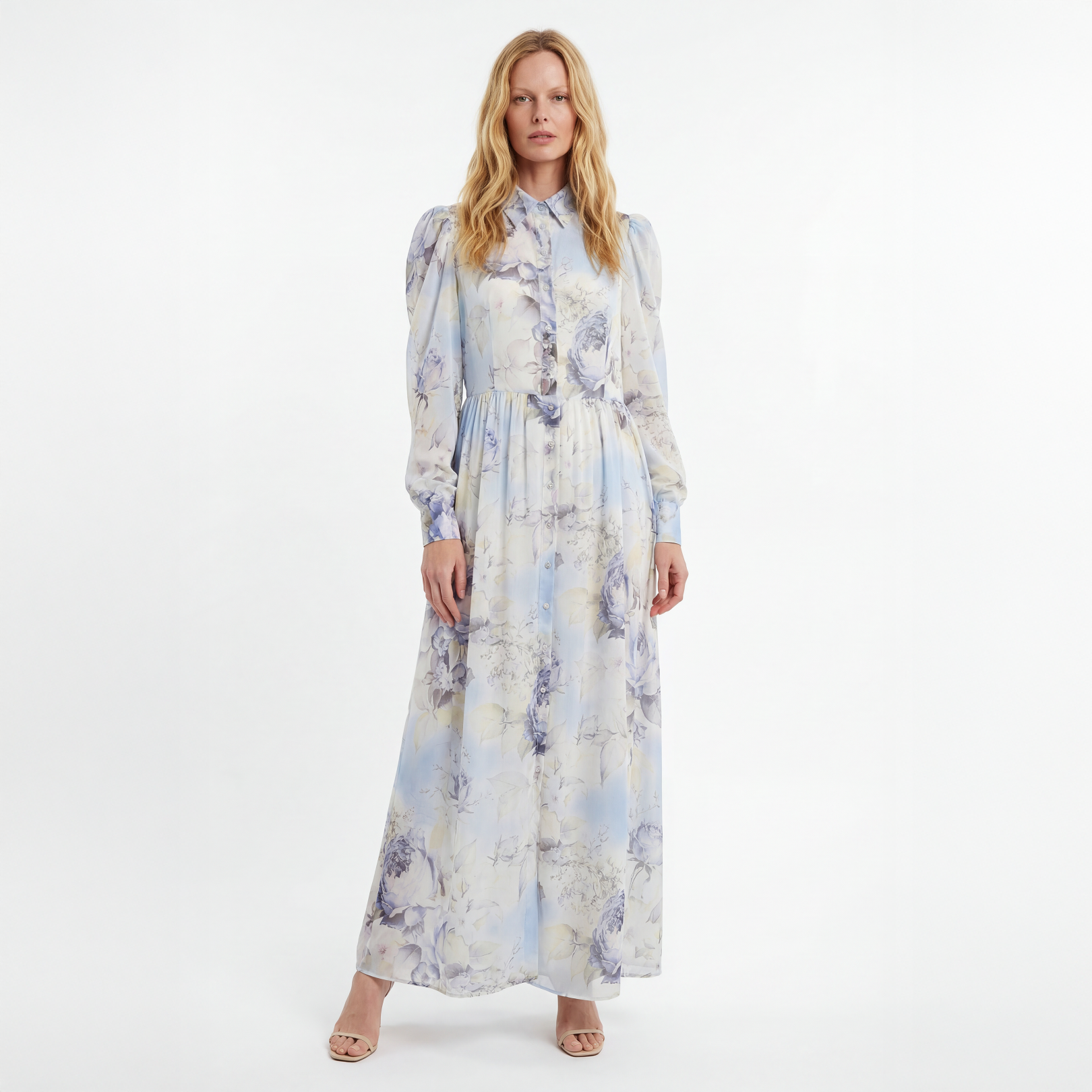 Abito lungo chemisier con stampa floreale pastello, colletto classico e chiusura con bottoni.