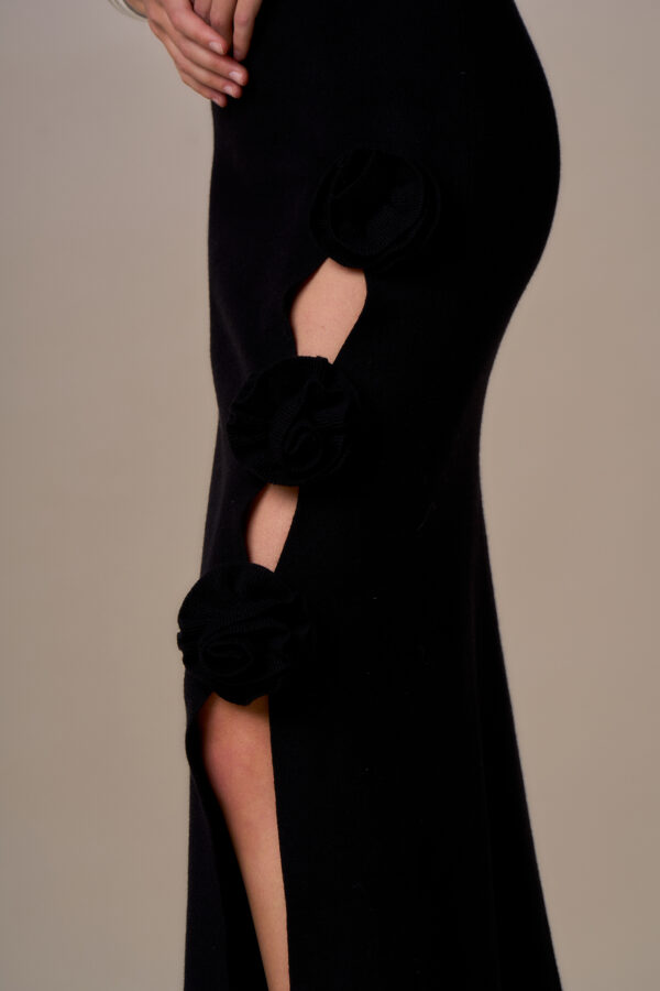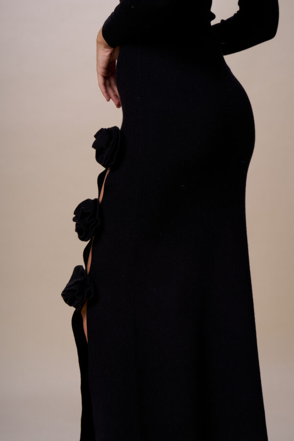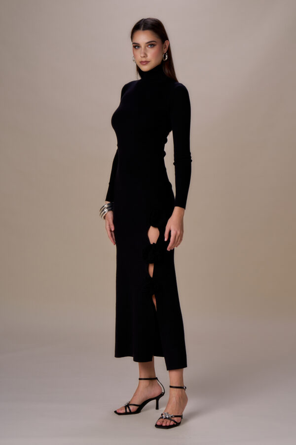 Abito lungo dolcevita in maglia elasticizzata con spacco laterale e rose tridimensionali.