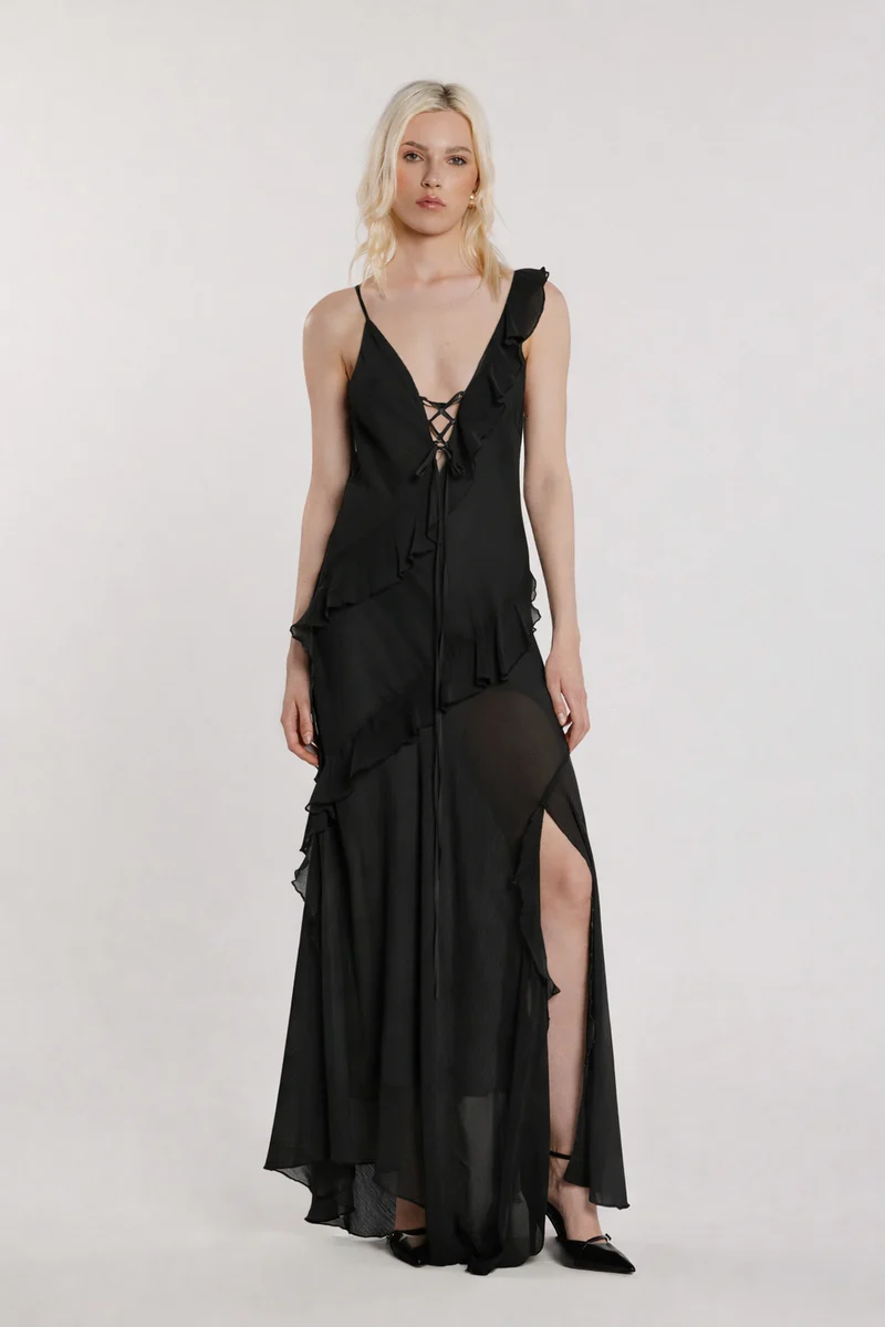 Abito lungo nero con scollo a V incrociato, volant asimmetrici sulla gonna e profondo spacco laterale.