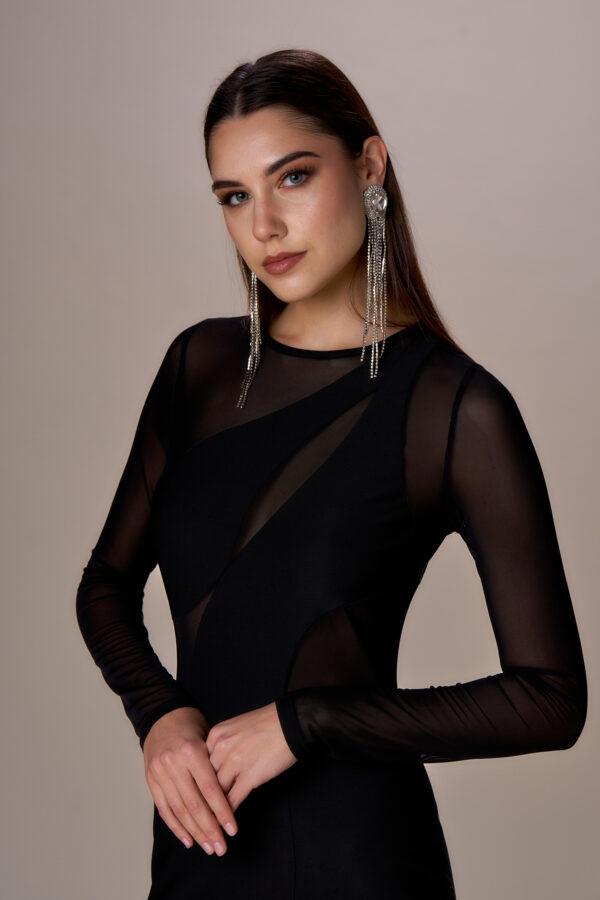 Abito lungo elasticizzato con trasparenze in tulle tono su tono.