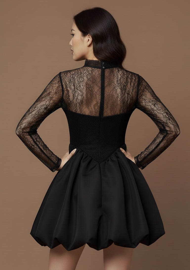 Abito a manica lunga in pizzo con gonna a palloncino effetto taffetà.