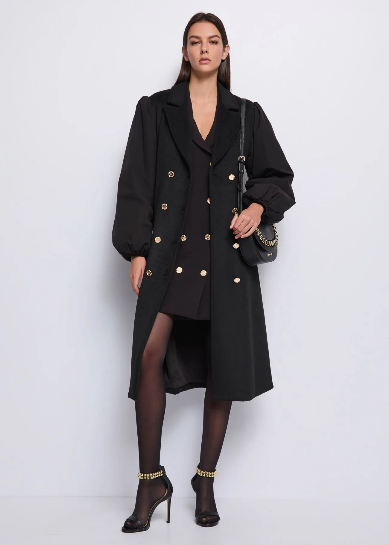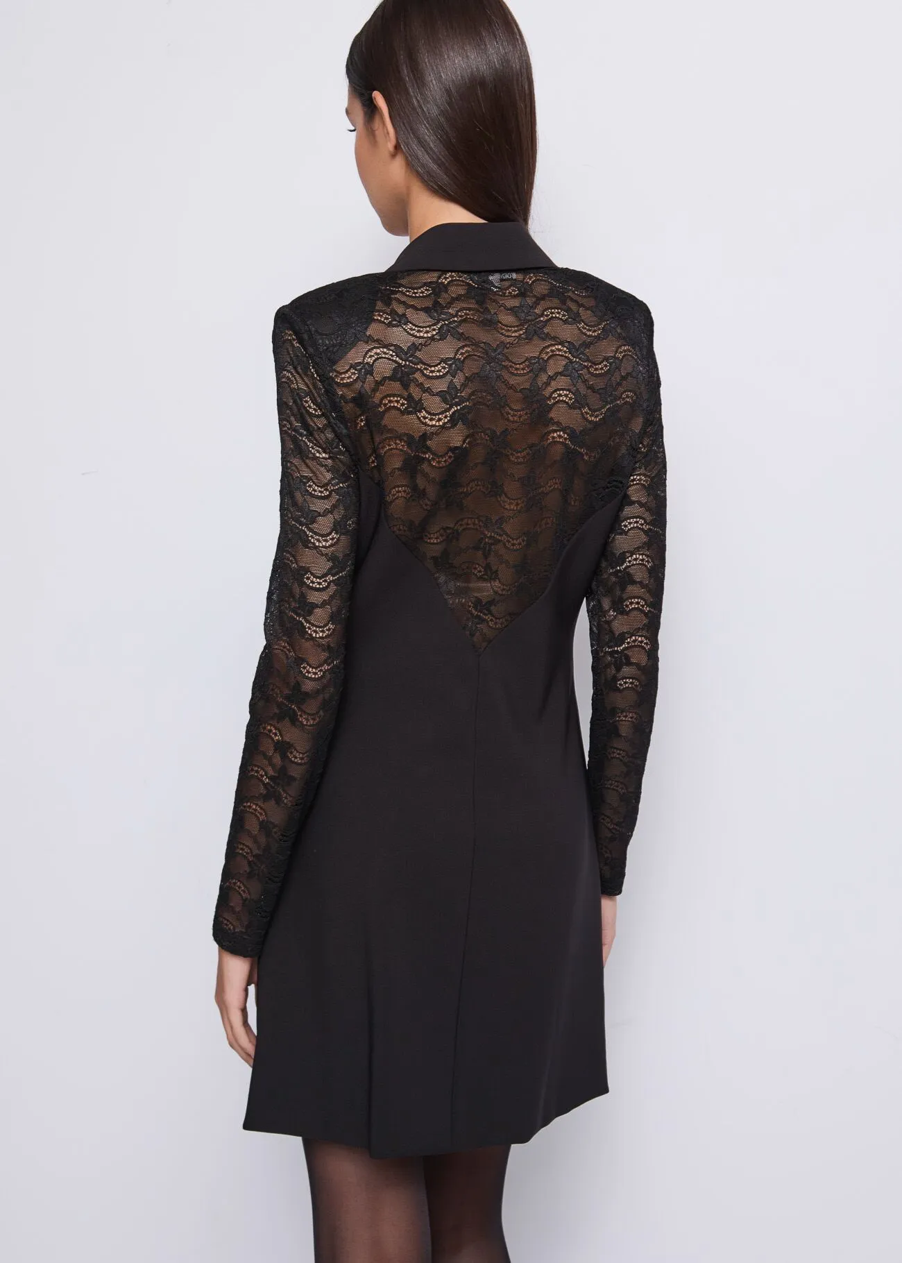 Abitino doppiopetto in tessuto tecnico con maniche e retro in pizzo, revers a lancia e bottoni dorati.