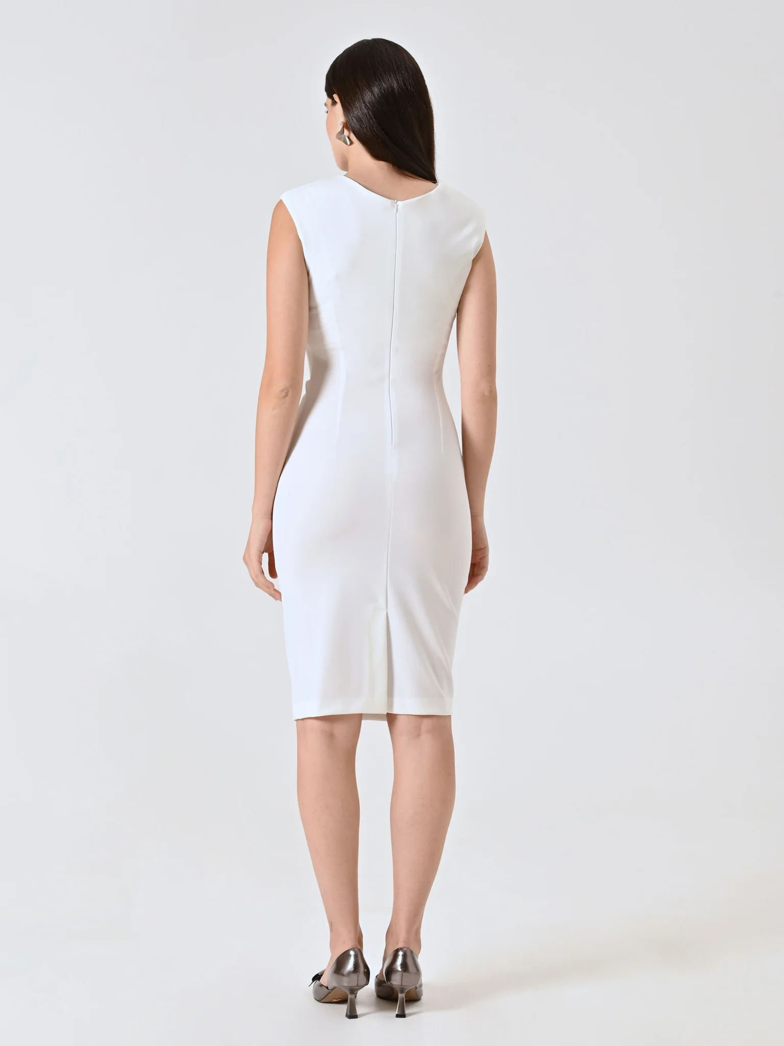 Abito tubino bianco midi senza manica con drappeggio laterale.
