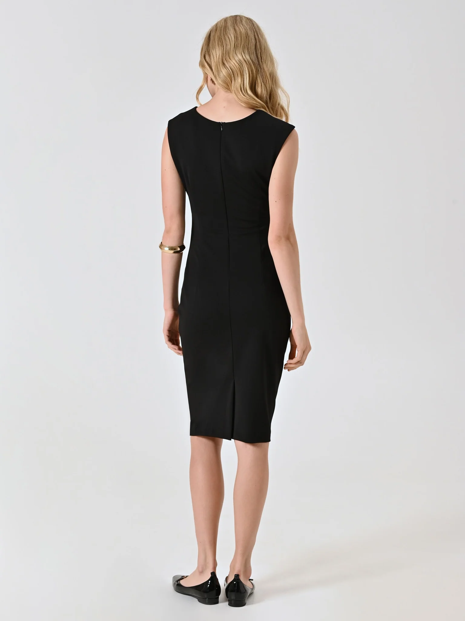 Abito tubino nero midi senza manica con drappeggio laterale.