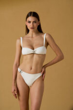Bikini bianco con top a balconcino, applicazioni a stella marina gioiello removibile con slip a brasiliana.