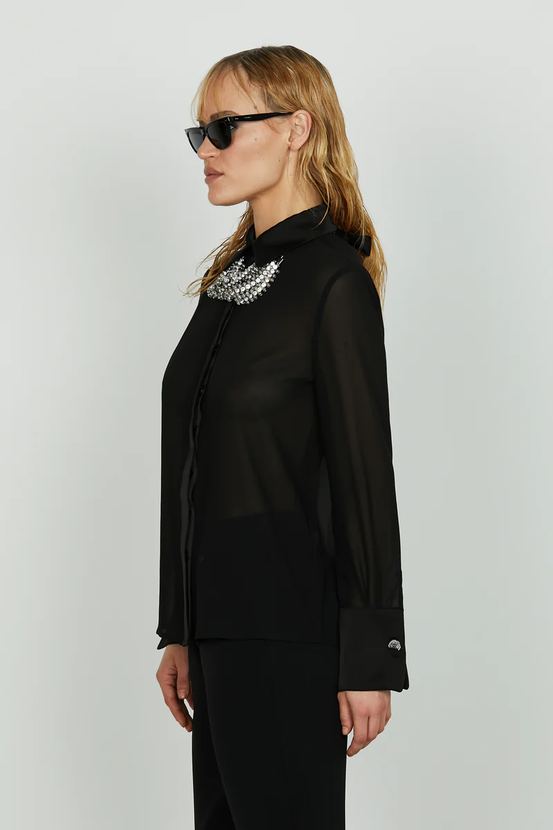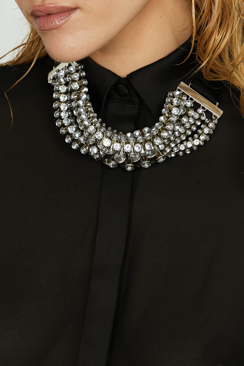Camicia a manica lunga con polsini e dettagli in raso tono su tono impreziosita da una collana full strass removibile.