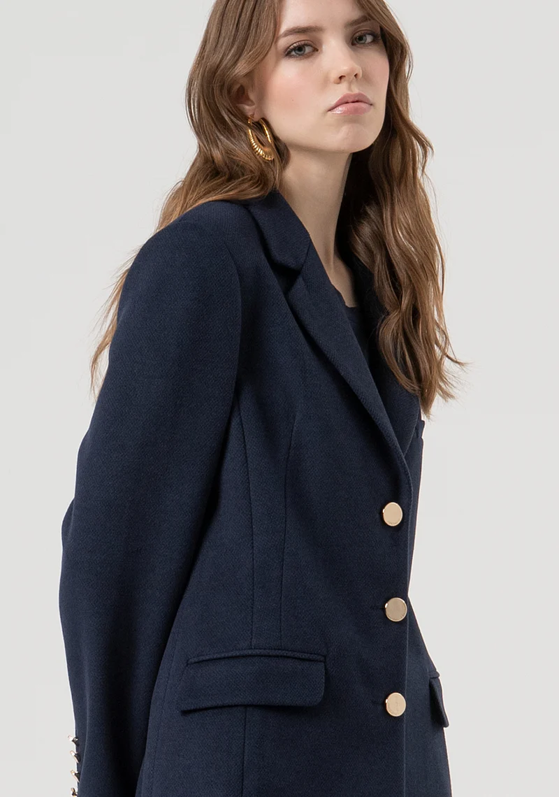 Cappotto lunghezza media monopetto con bottoni dorati e revers.