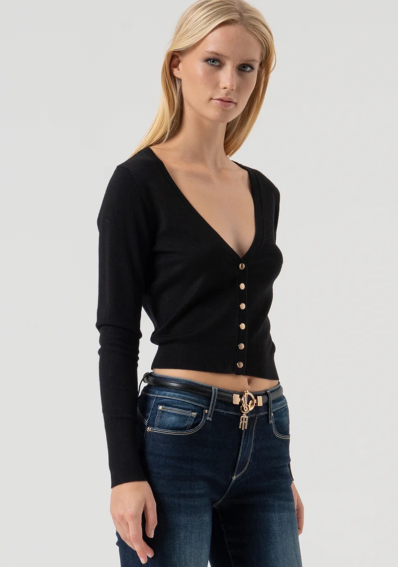 Cardigan in viscosa con bottoni dorati e profonda scollatura a “V”.