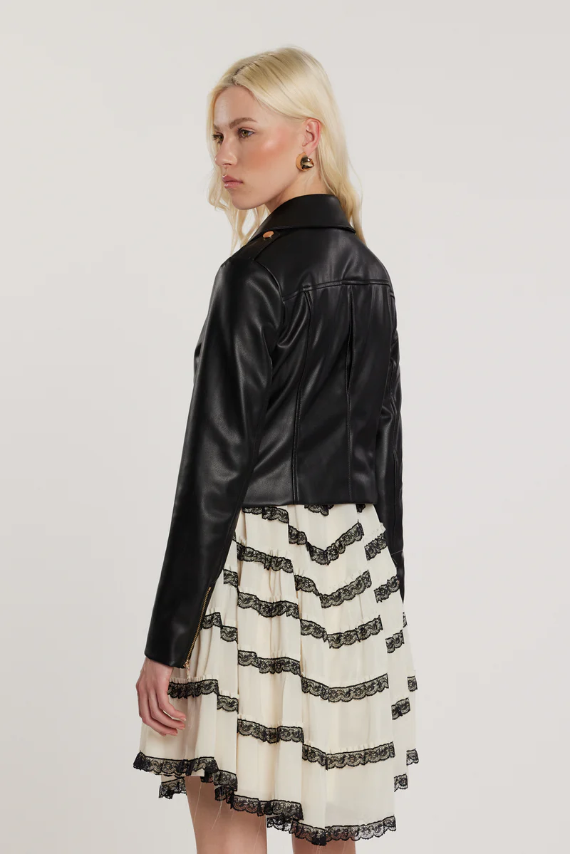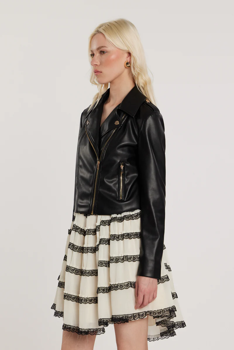 Chiodo in ecopelle nera con revers classici, chiusura a zip asimmetrica e tasche laterali.