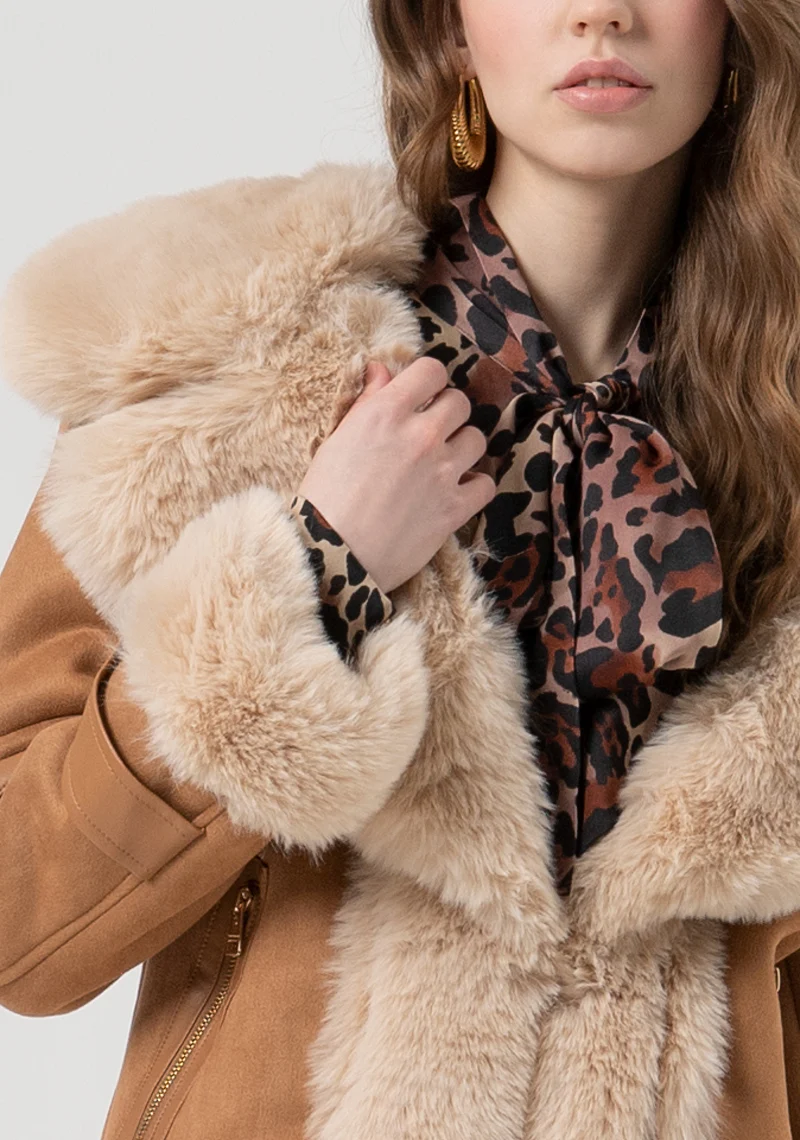 Eco montone color cammello con dettagli dorati ed eco pelliccia color crema.