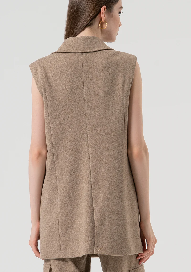 Gilet lungo in flanella beige, doppiopetto con bottoni dorati e spalline imbottite.