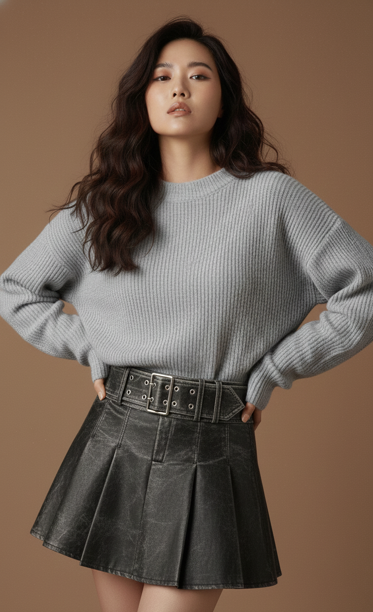Gonnellina plissé in ecopelle lavorata con cintura regolabile e removibile.