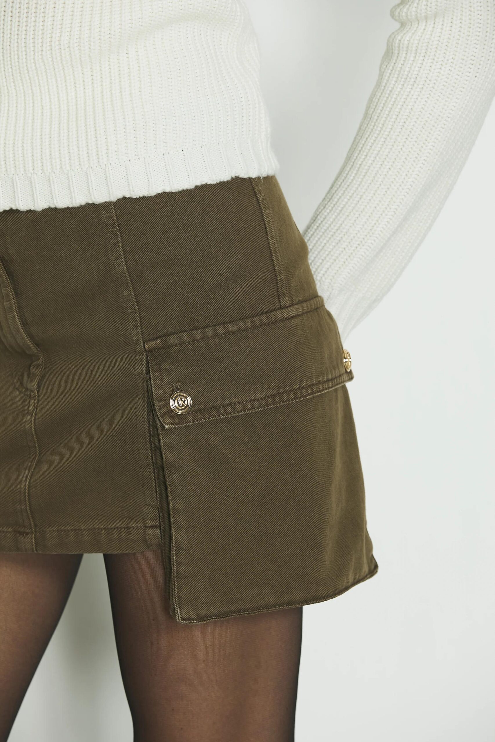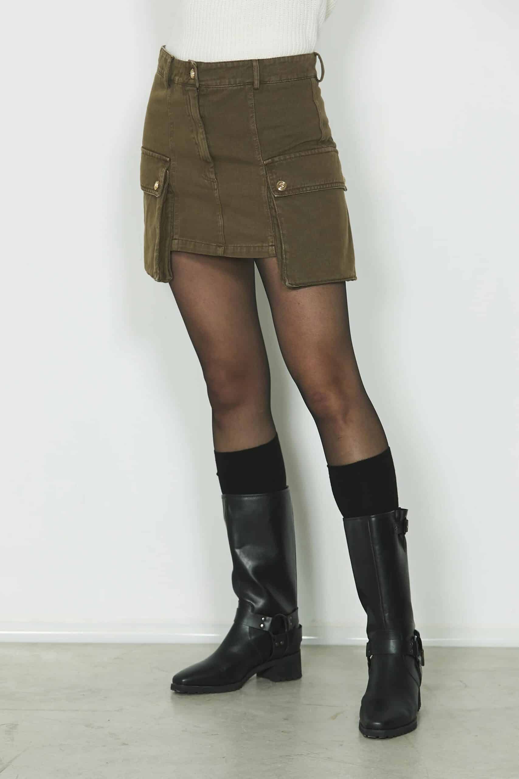 Non puo’ mancare nel tuo guardaroba la mini in denim color militare con bottoni dorati di Relish! Perfetta con l’anfibio o un texano, da abbinare ad un maglione o un body aderente.
