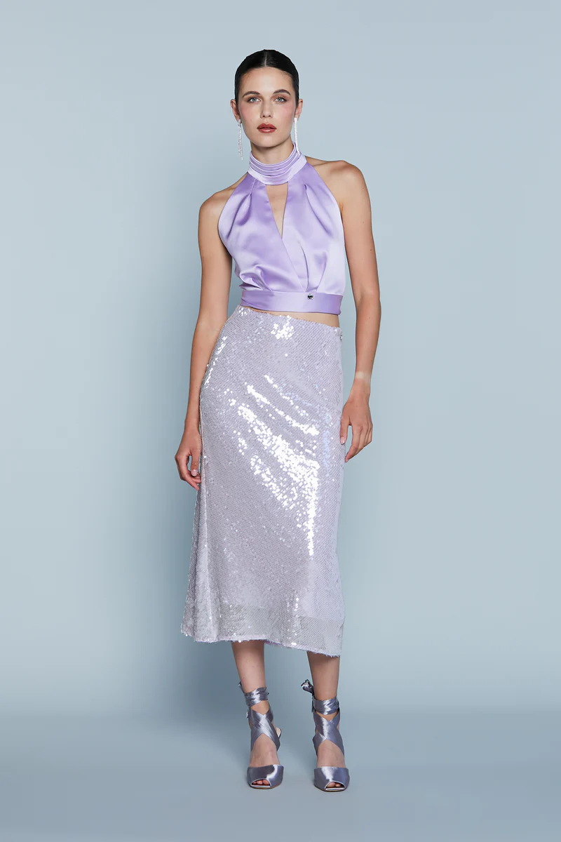 Non perdere l’occasione di arricchire il tuo guardaroba con la GONNA MIDÌ PAILLETTES LILLA ALEGRE Relish.
