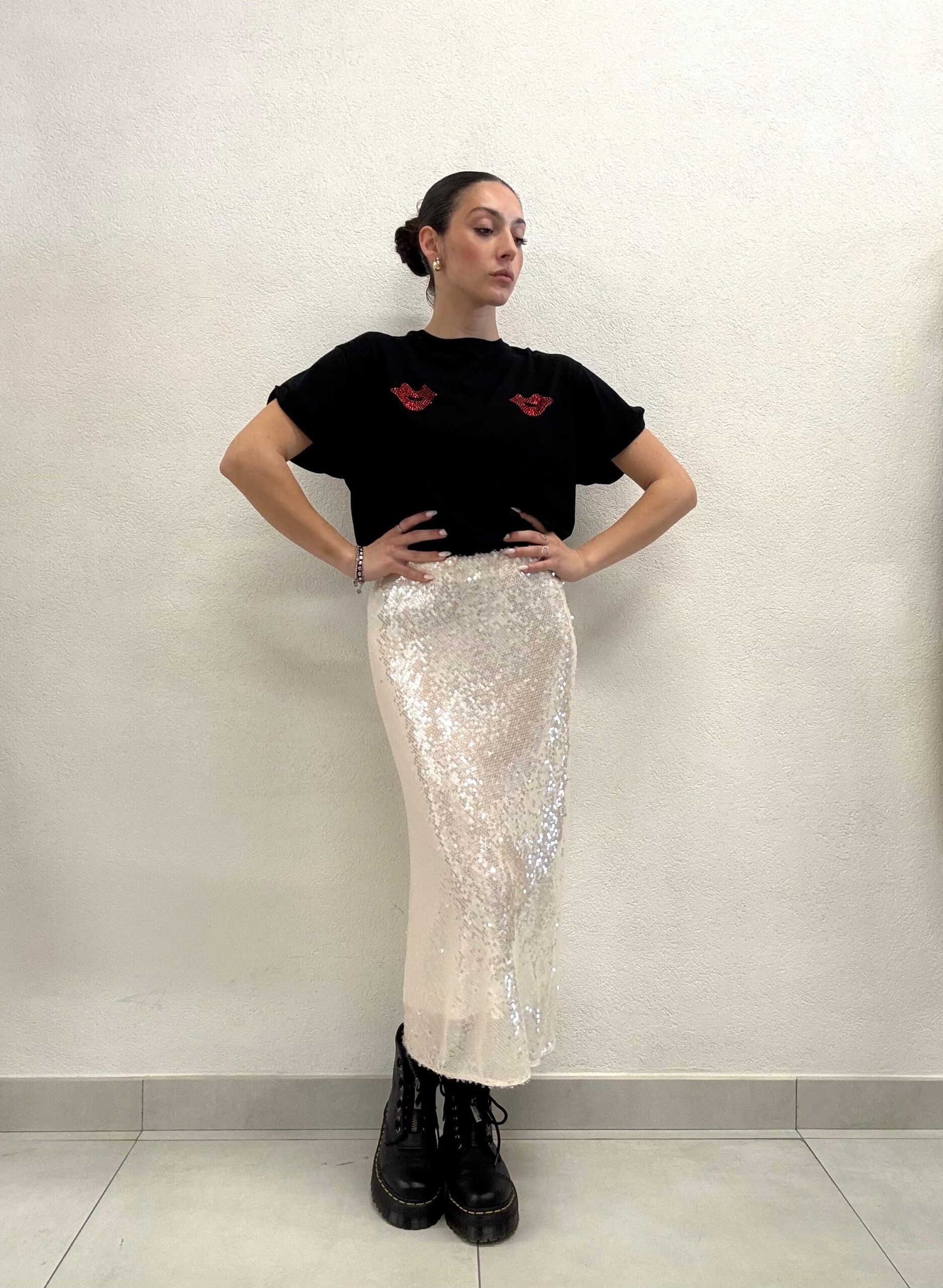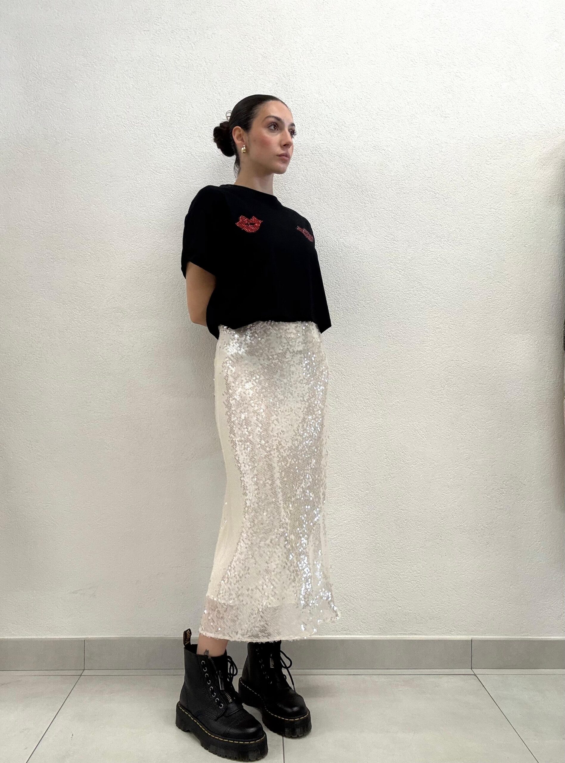 Gonna lunghezza midì full paillettes con elastico in vita.