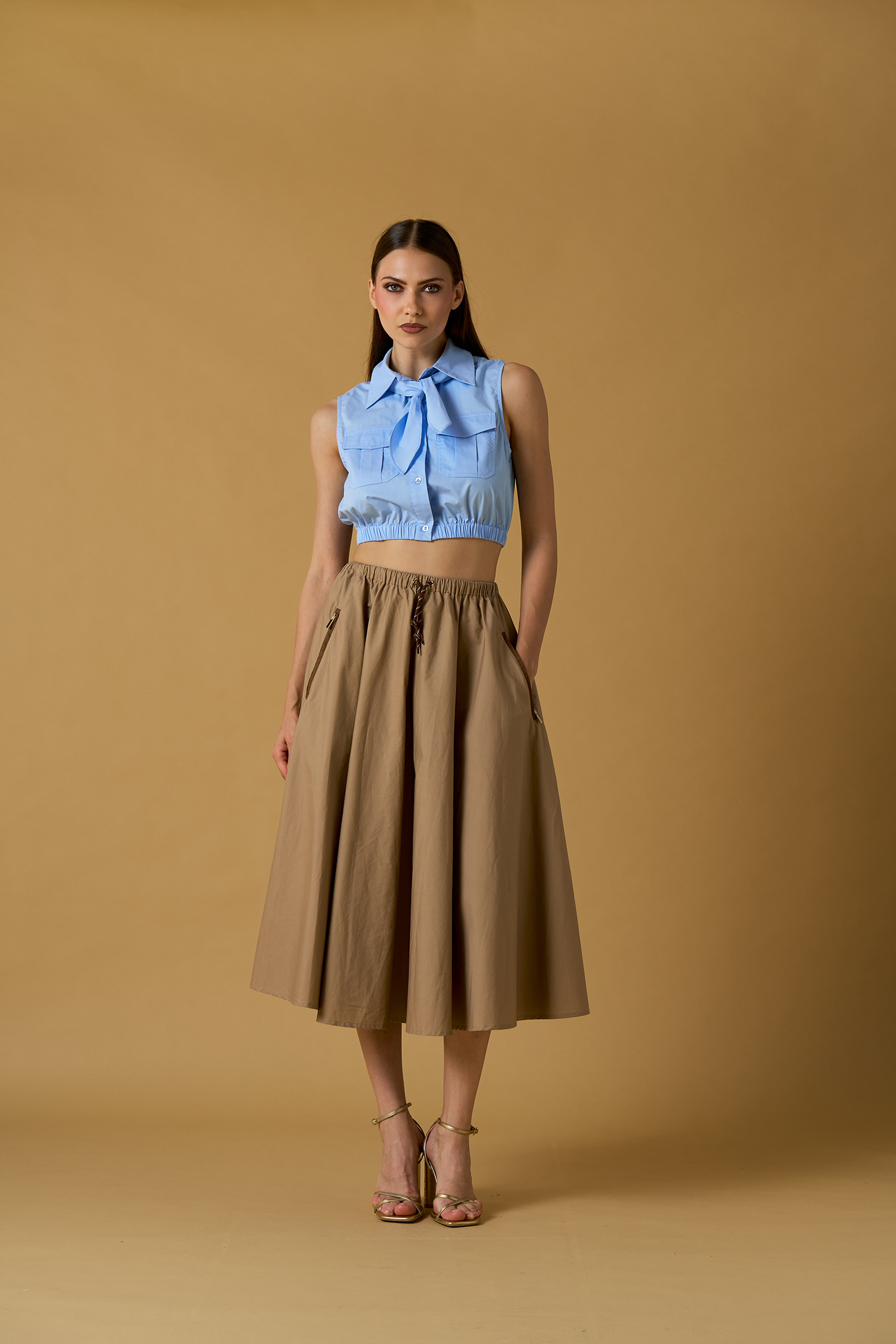Gonna midi in cotone a ruota safari con tasche laterali e coulisse in vita.