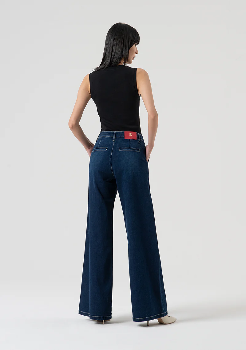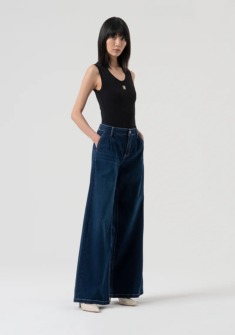Jeans maxi flare a vita media in denim scuro ed elasticizzato.