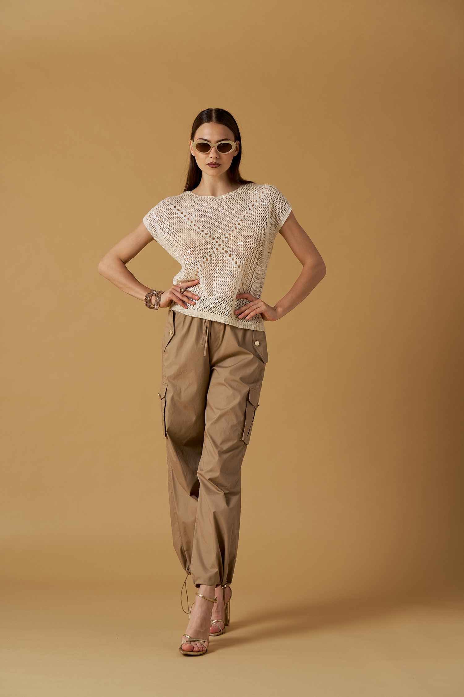 Maglia smanicata a rete avorio impreziosito da paillettes.