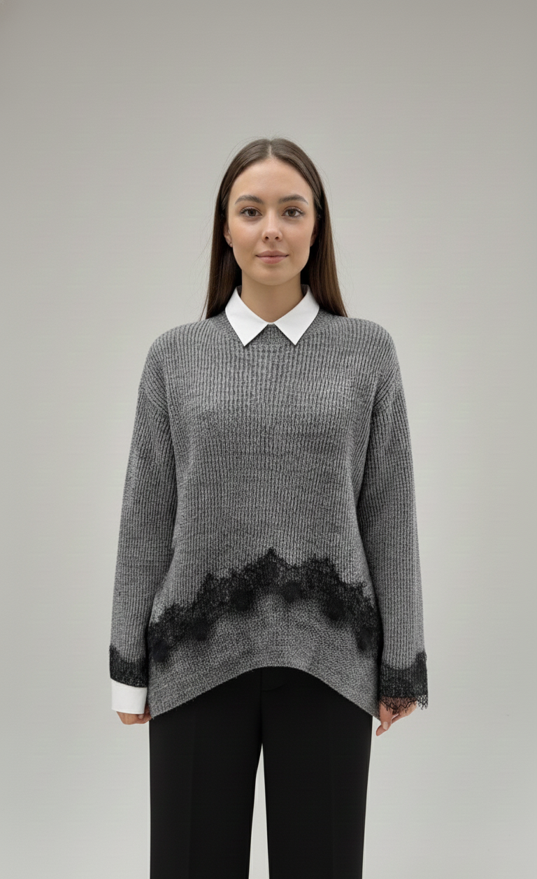 Maglioncino girocollo misto lana dal taglio comodo ed asimmetrico con inserti in pizzo sul fondo e sui polsini.