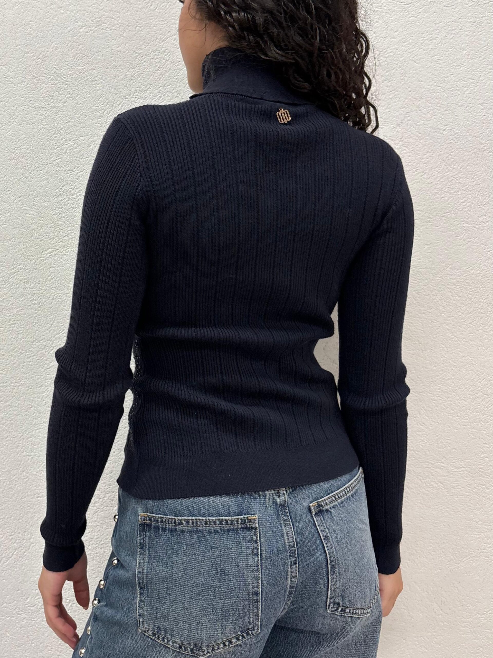 Pull dolcevita elasticizzato a costine con applicazioni strass tono su tono.