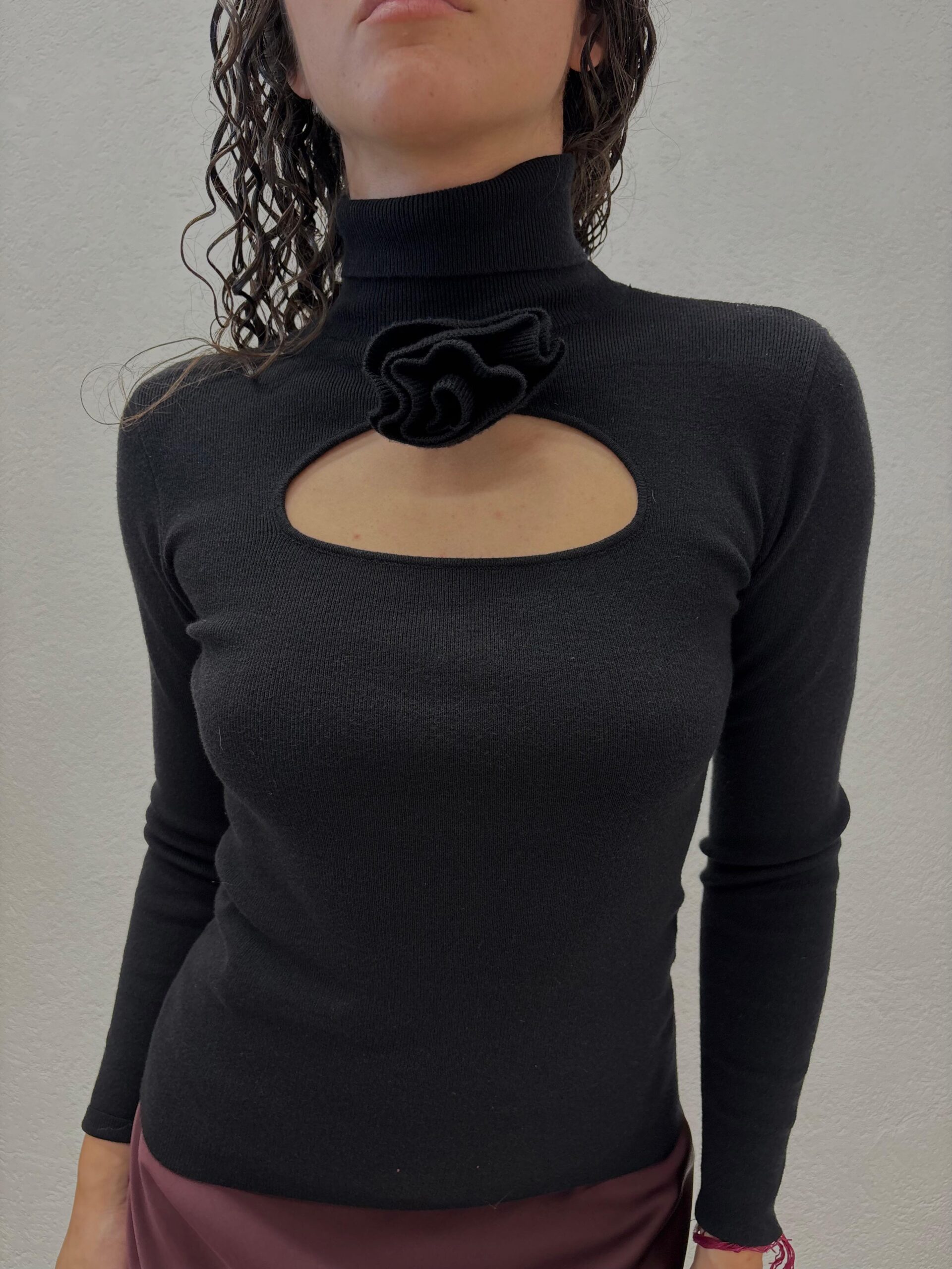 Maglia nera elasticizzata cut out e rosa tridimensionale.