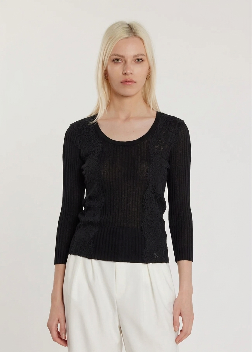 Maglia nera a costine con maniche a tre quarti, scollo rotondo e inserti verticali in pizzo ricamato sul davanti.