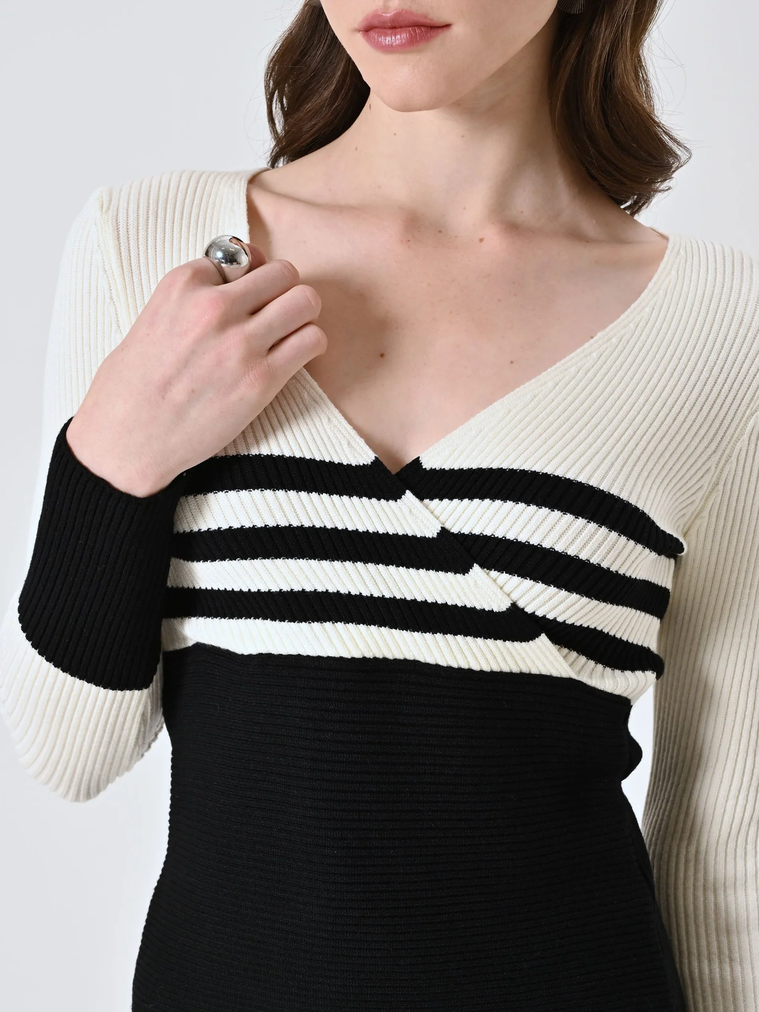 Maglioncino a manica lunga con scollatura incrociata in fantasia a righe bianche e nere.