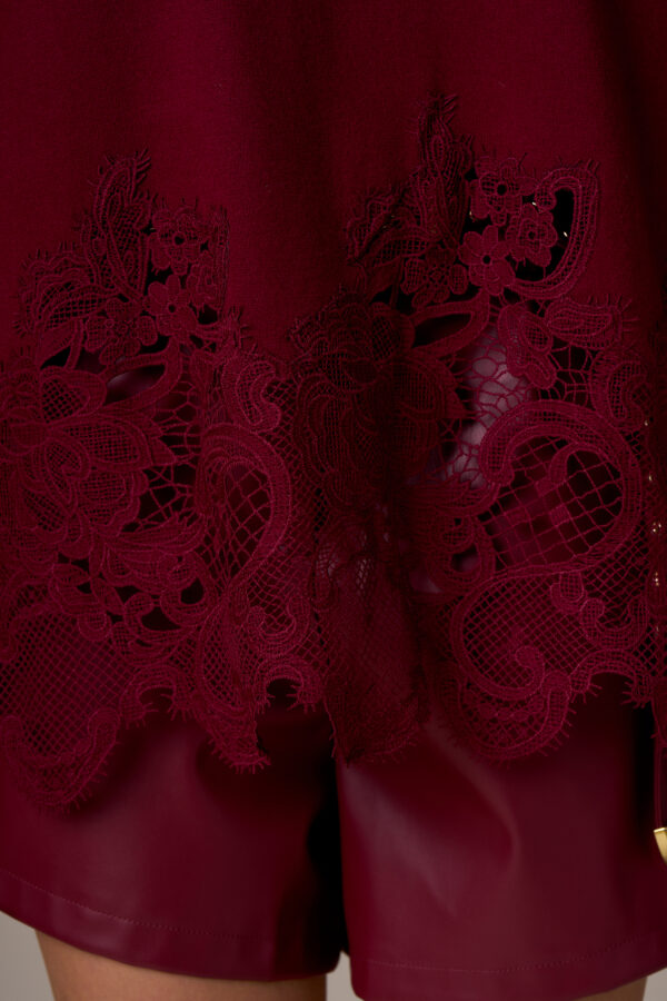 Maglia a V bordeaux con sfondo in pizzo macrame’.