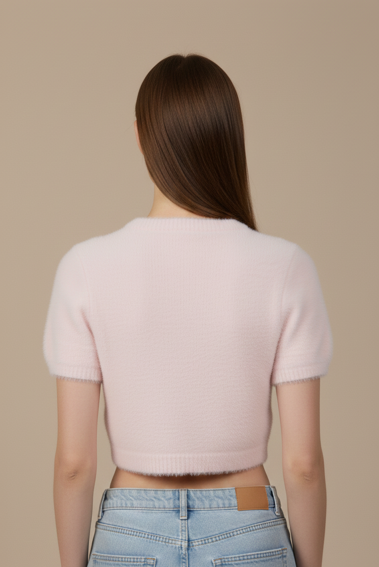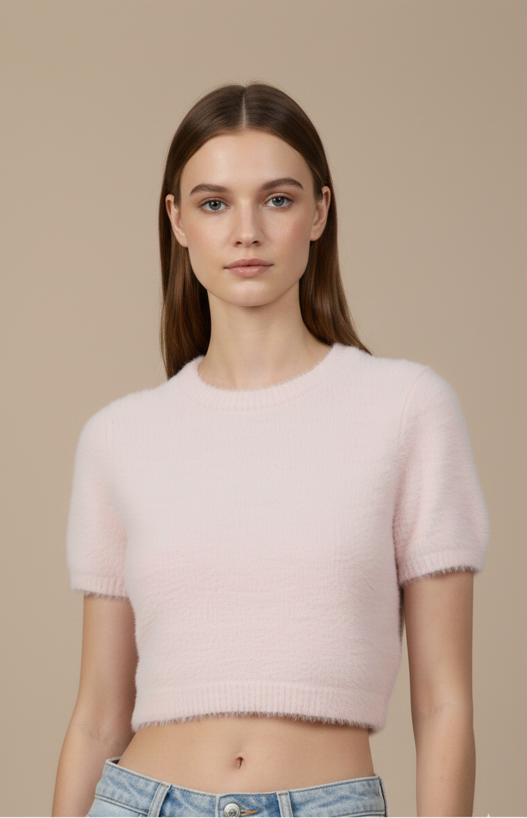 Maglioncino crop effetto peluche ultra soft girocollo a manica corta.