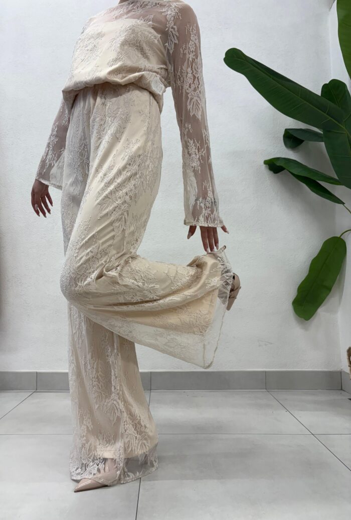 Non perdere l’occasione di arricchire il tuo guardaroba con il PANTALONE FLARE IN PIZZO PANNA Kontatto.