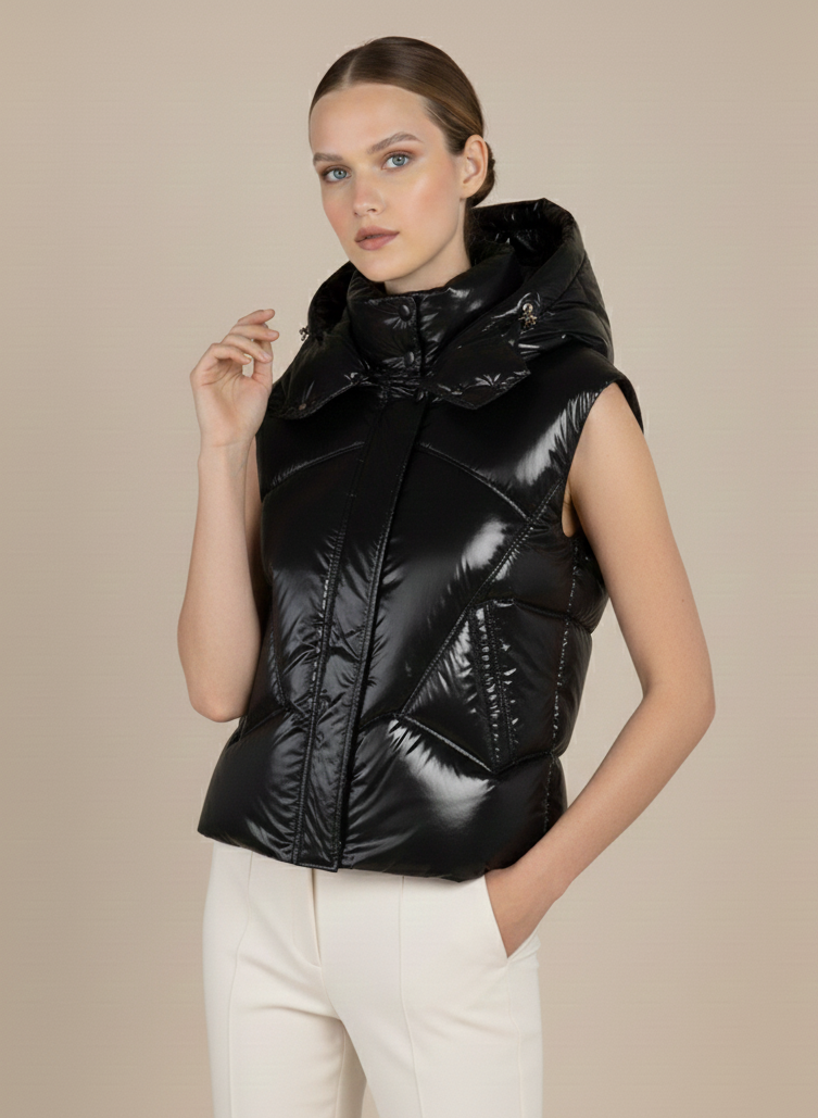 Piumino in tessuto lucido effetto laminato, con maniche e cappuccio rimovibili, indossabile anche come gilet.