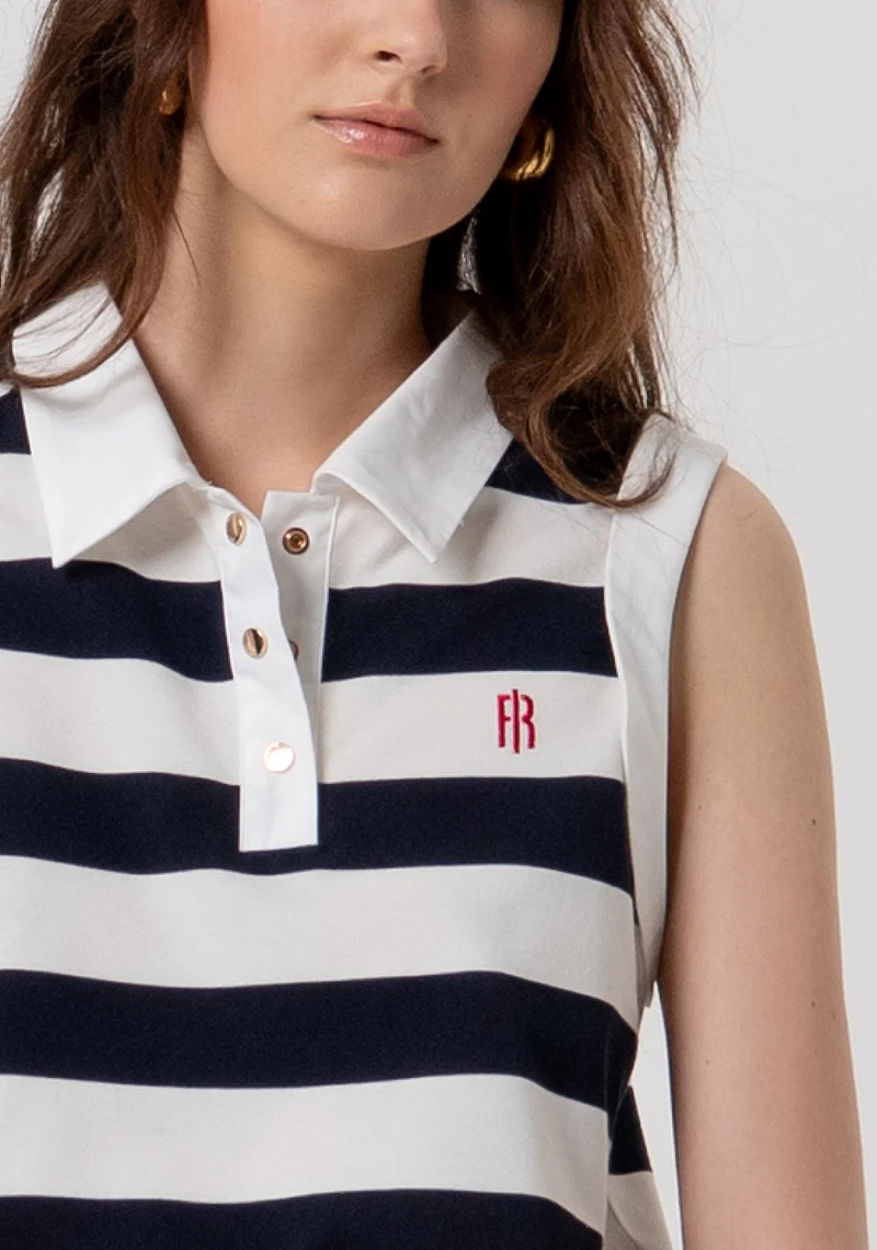 Polo senza maniche a righe bianche e blu con bottoni dorati.
