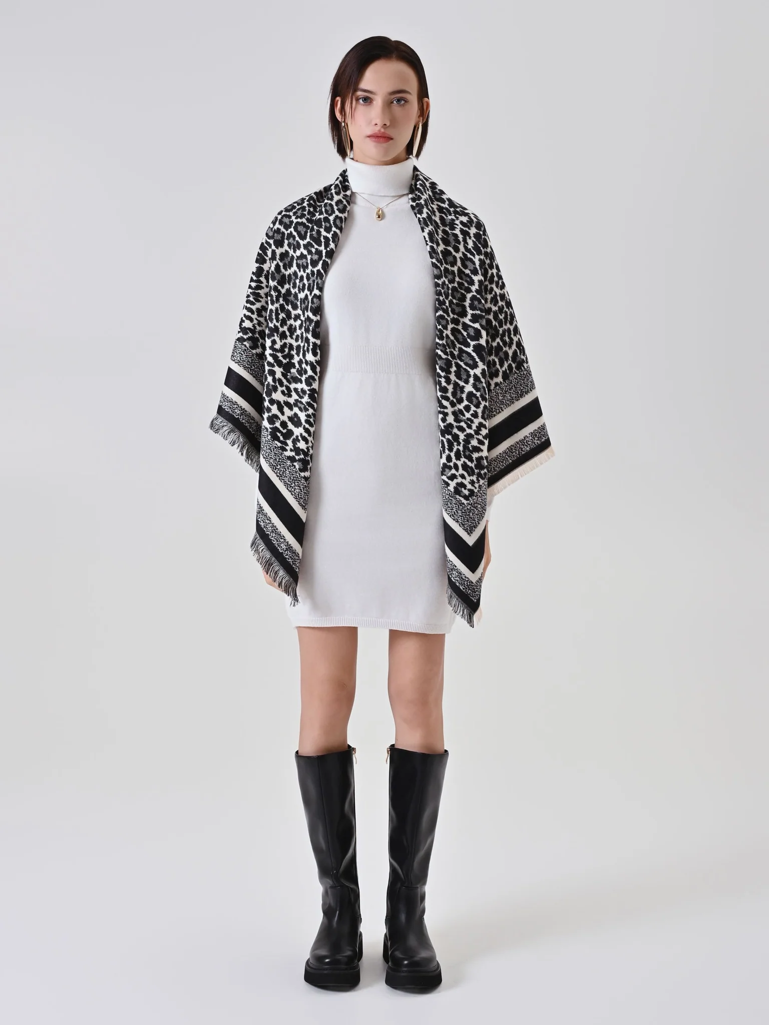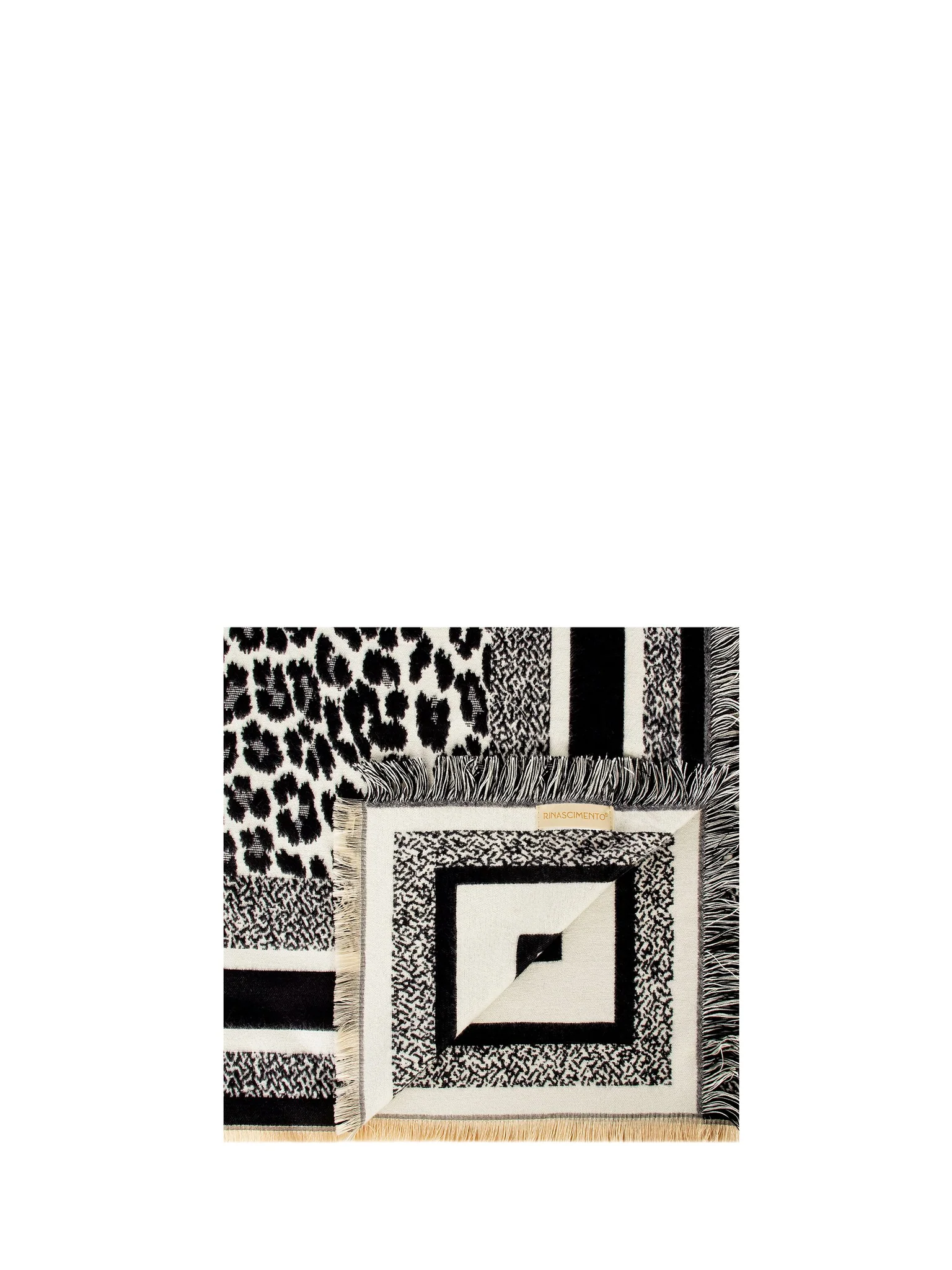 Sciarpa in viscosa in fantasia animalier bianca e nera con sfrangiatura su tutto il bordo.