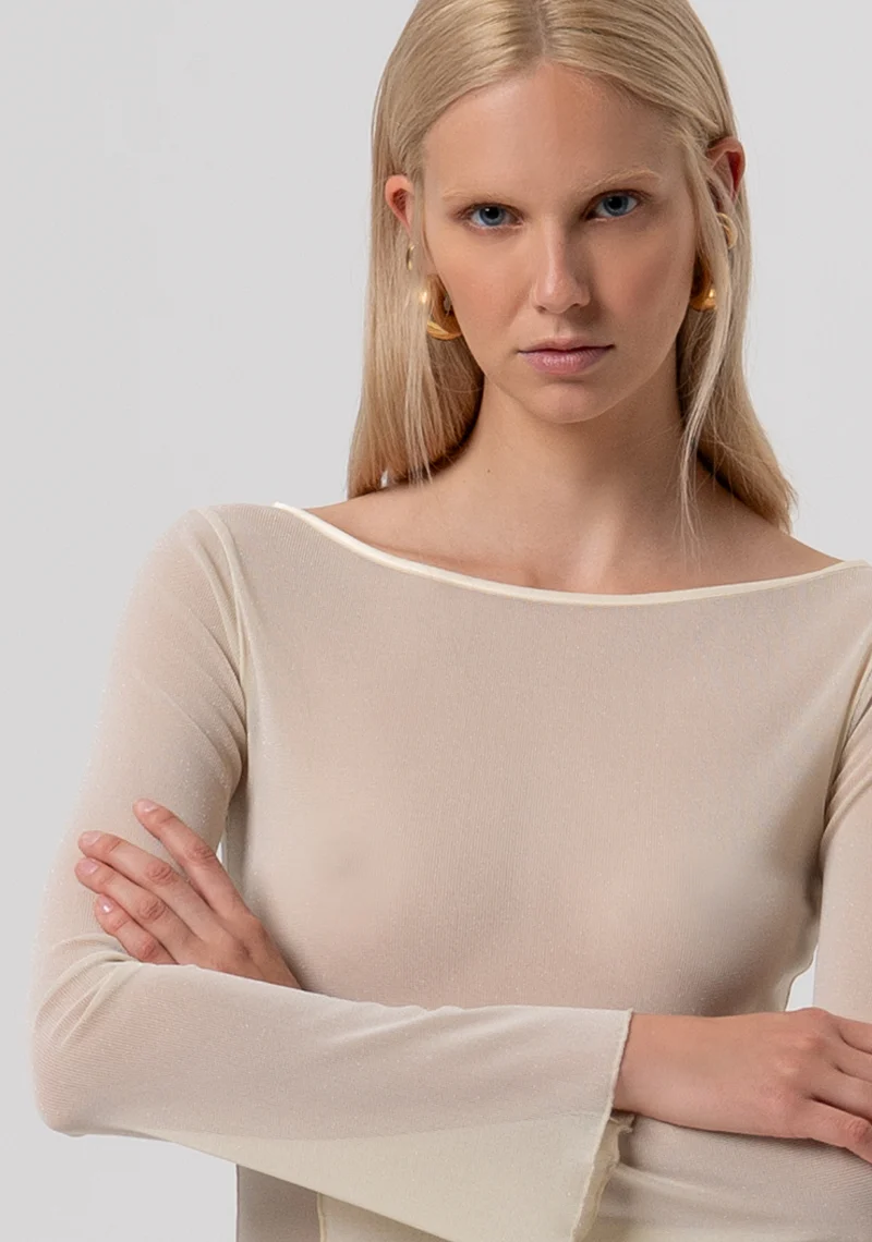 T-shirt oro in lurex a manica lunga trasparente con scollo a barca e manica svasata.
