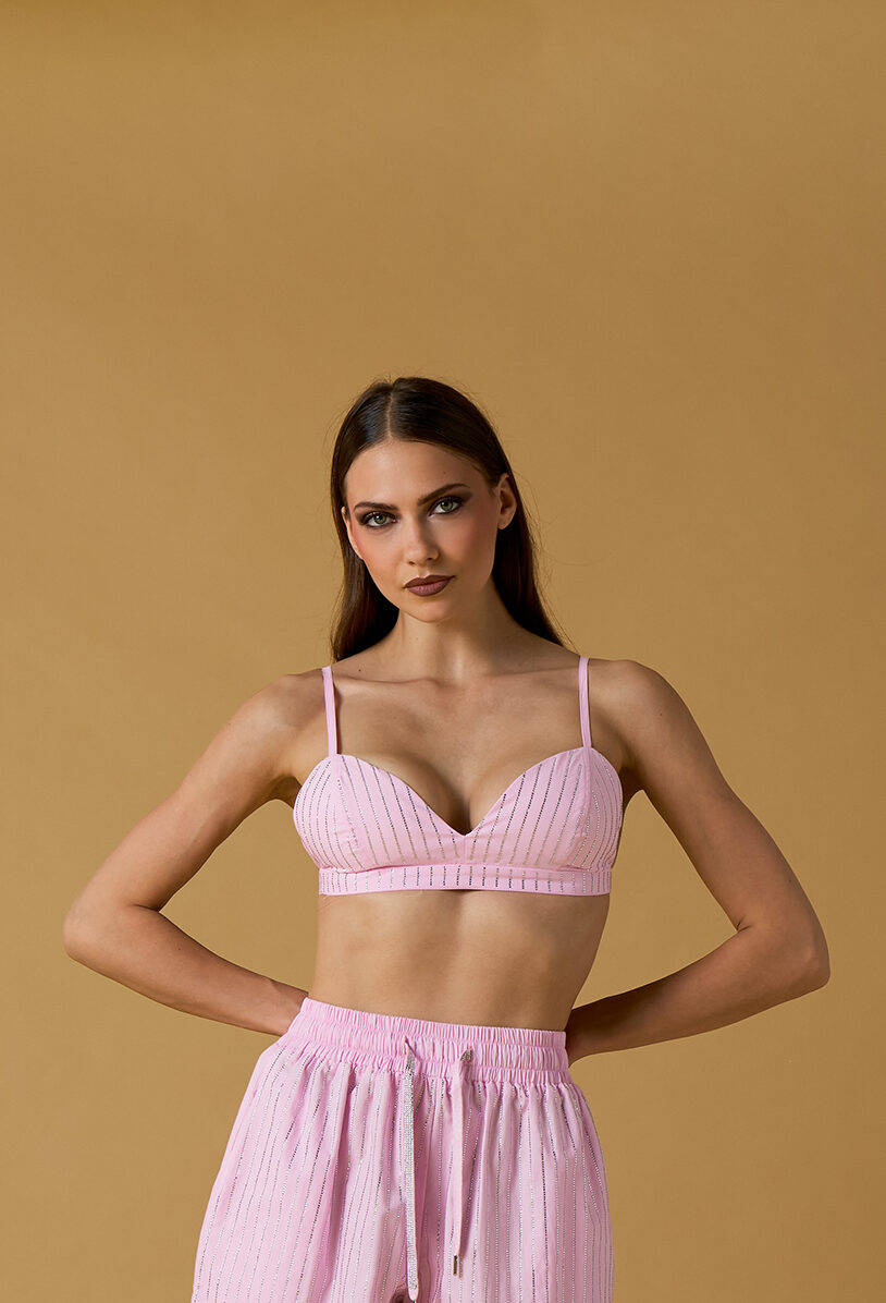 Top in cotone gessato rosa impreziosito da strass.