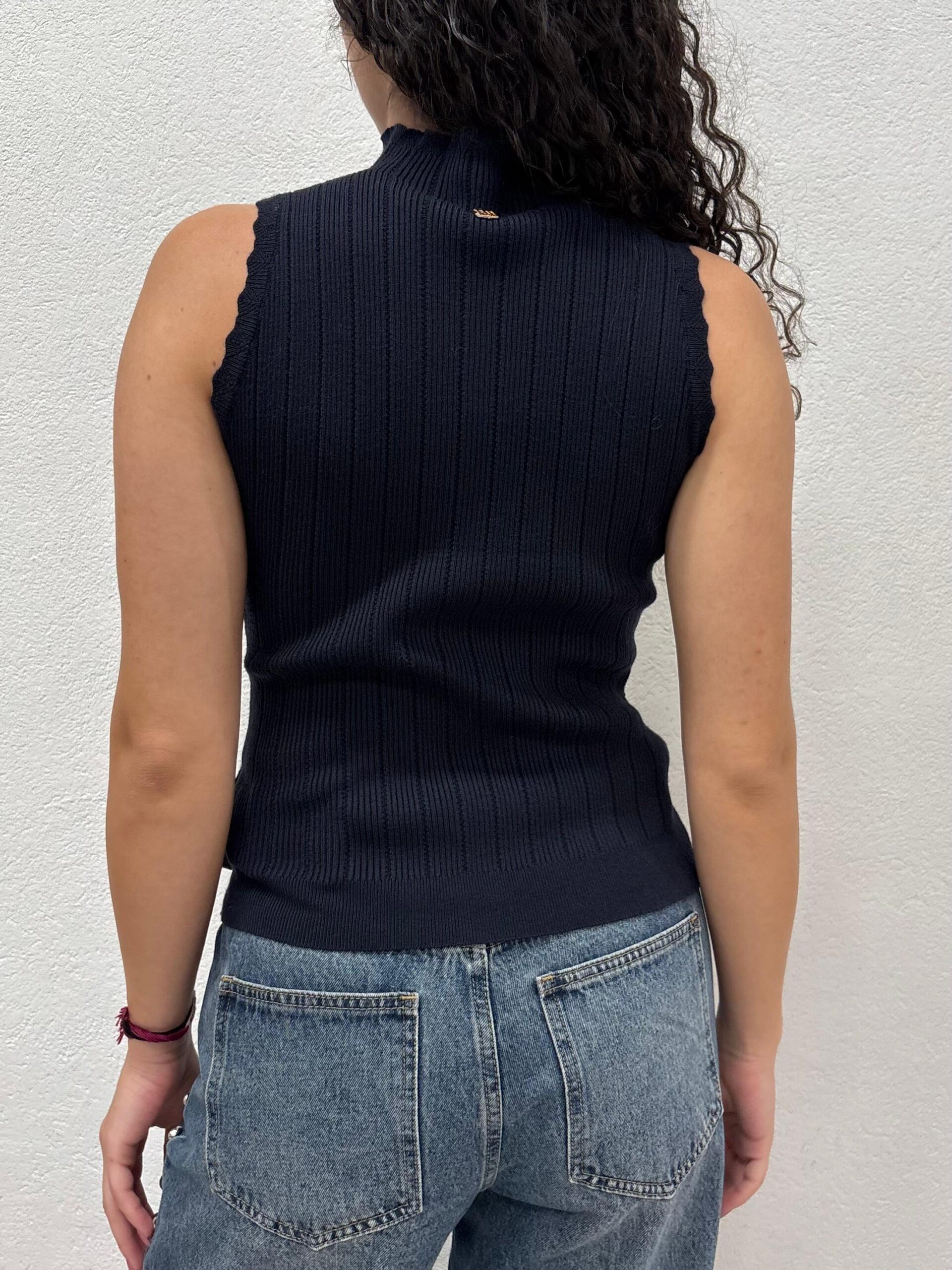 Top lupetto smanicato ed elasticizzato a costine con applicazioni strass tono su tono.