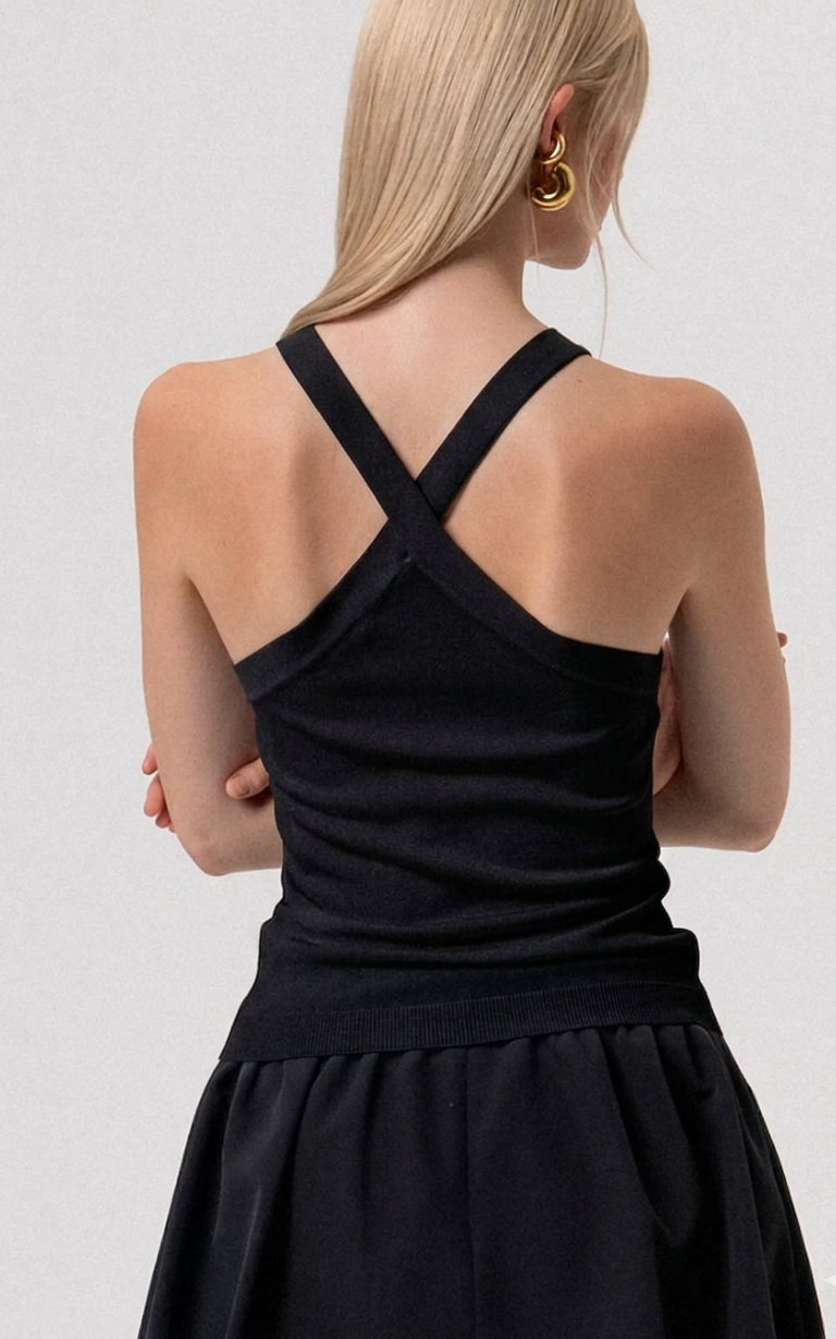 Top smanicato nero a costine con borchie, scollo all’americana e incrocio sulla schiena.