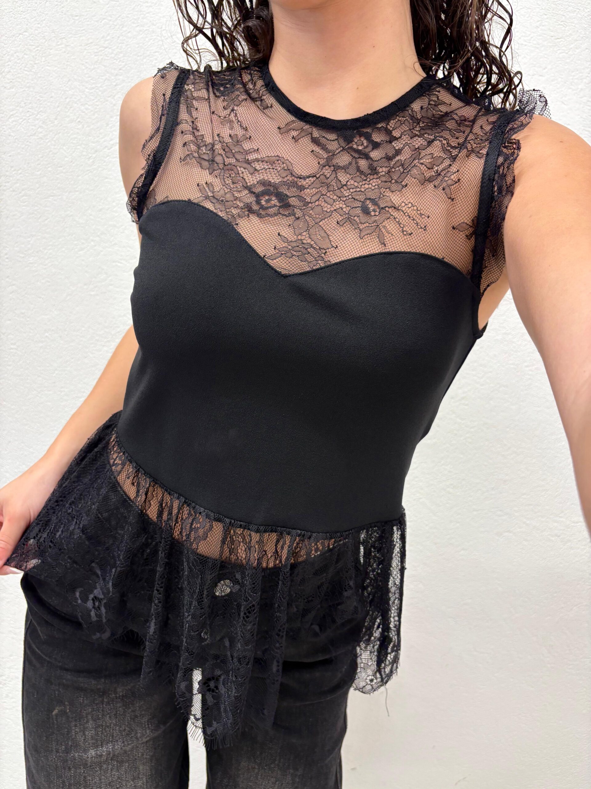 Top smanicato con scollo cuore ed inserti in pizzo tono su tono.