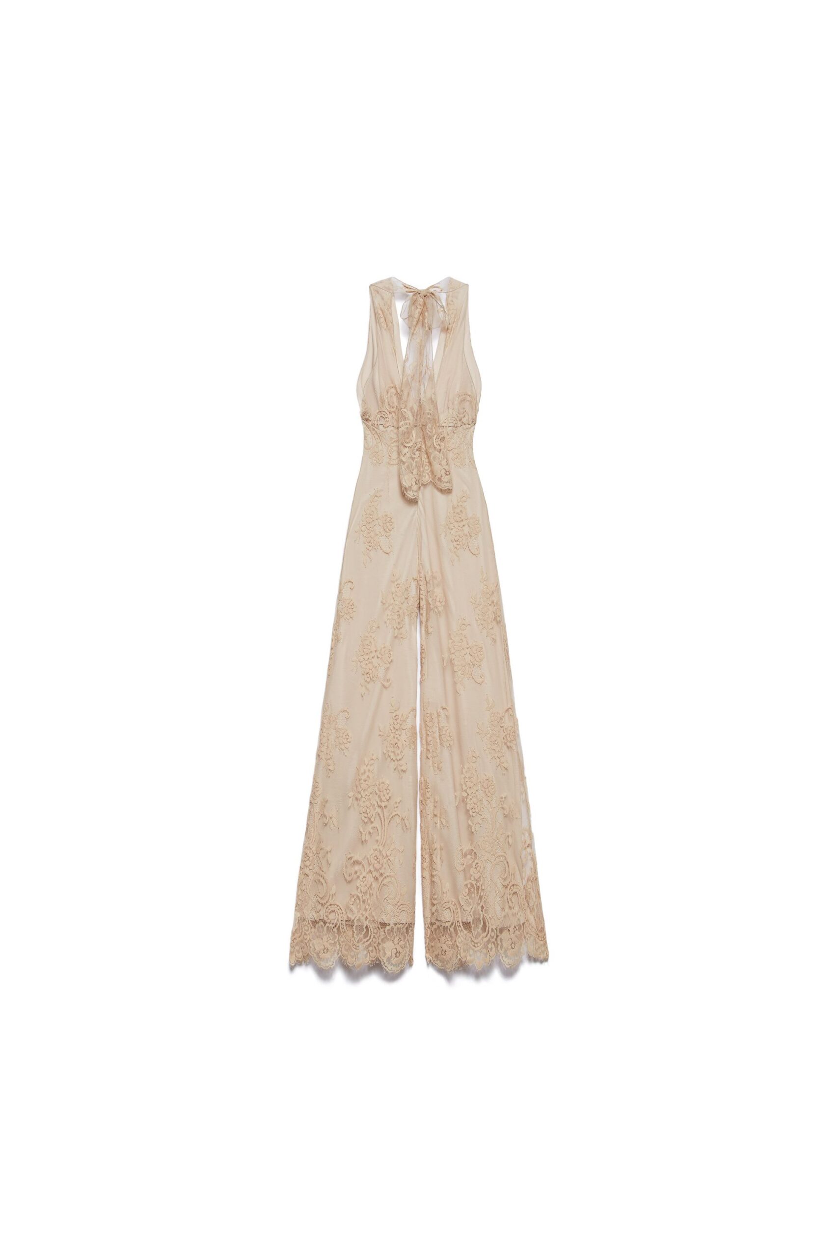 Tuta intera in pizzo avorio con profonda scollatura sul davanti e sulla schiena.