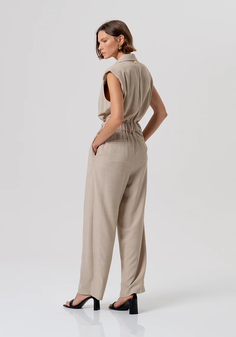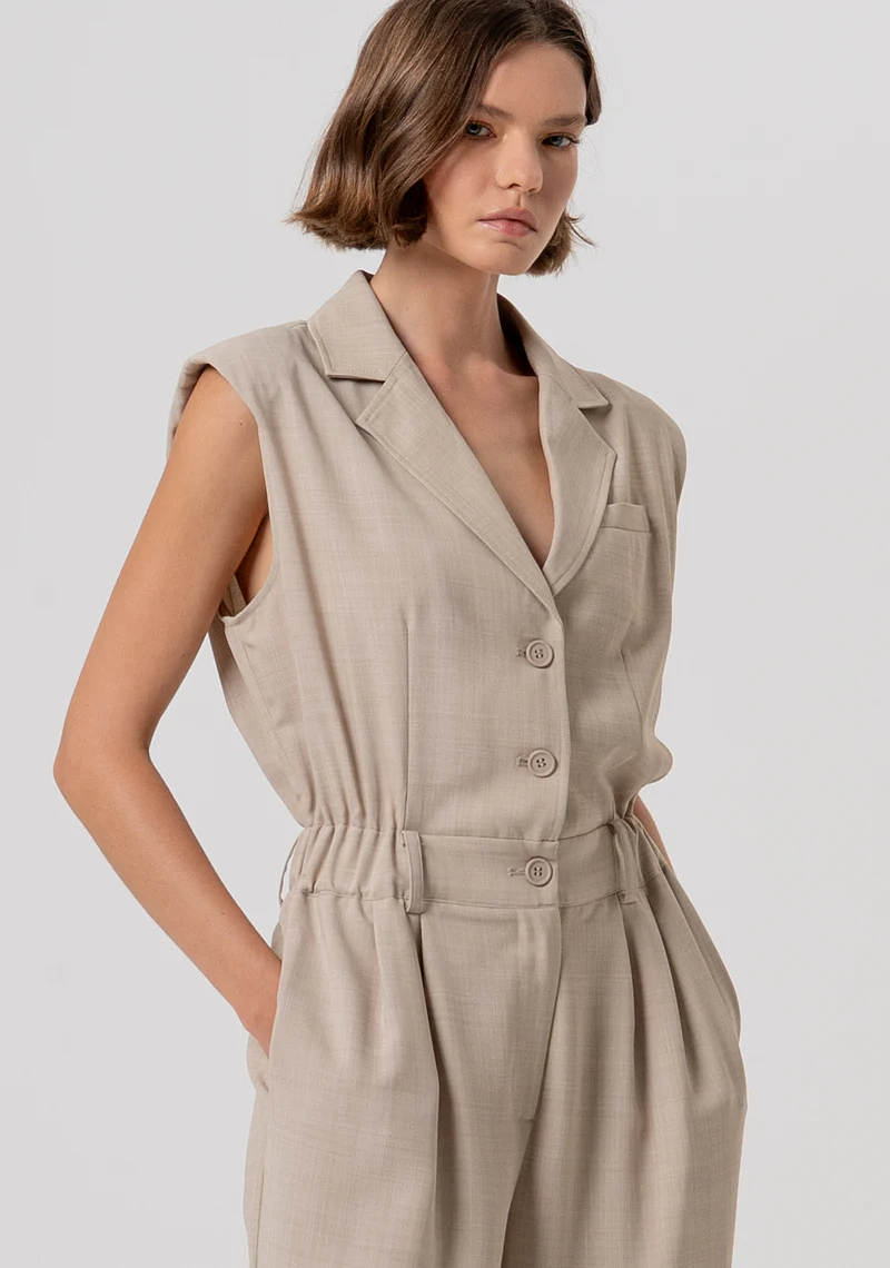 Tuta intera senza maniche sabbia con revers, bottoni frontali e pantalone dritto.